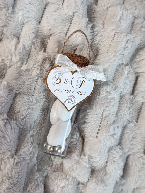 Fiole à dragées de 8 cm de hauteur et 3 cm de largeur.